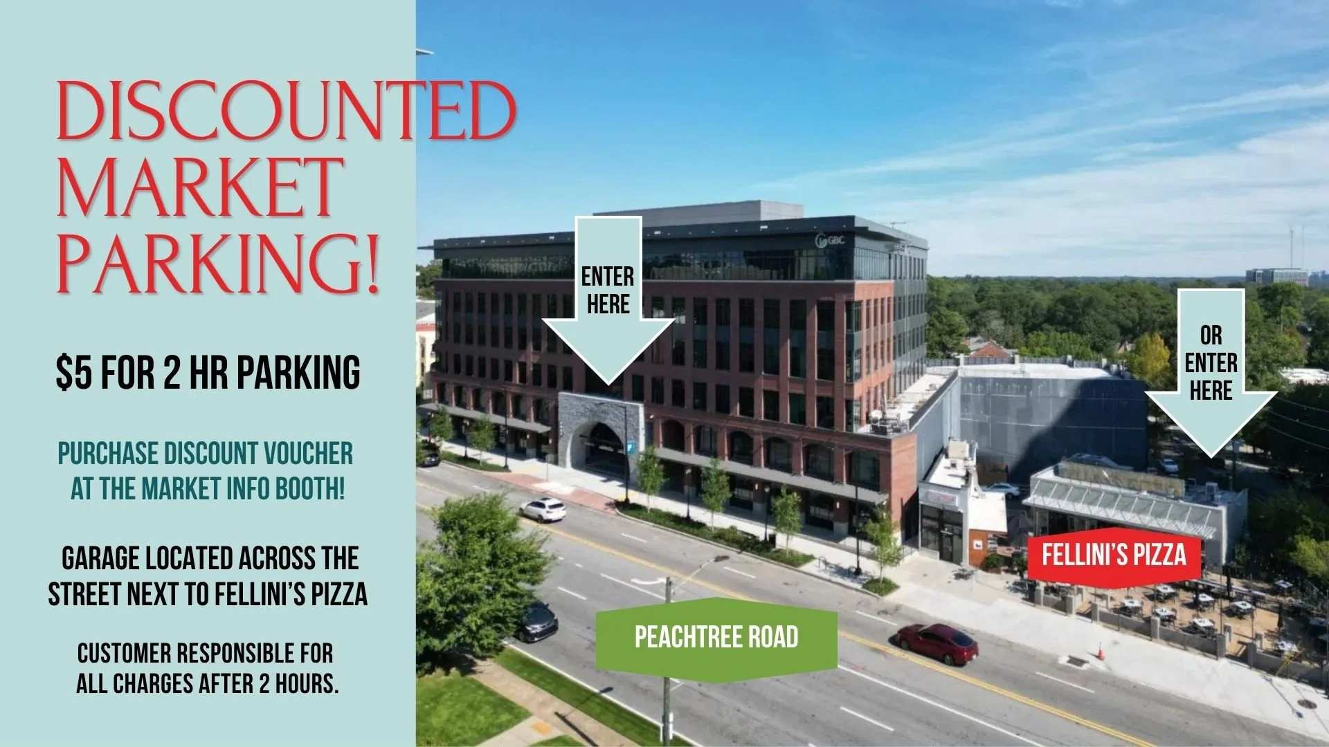Parking garage located across the street in the Georgia Banking Company building. Entrances available on Peachtree Road besides La Fonda and behind Fellini’s on Rumson Rd.